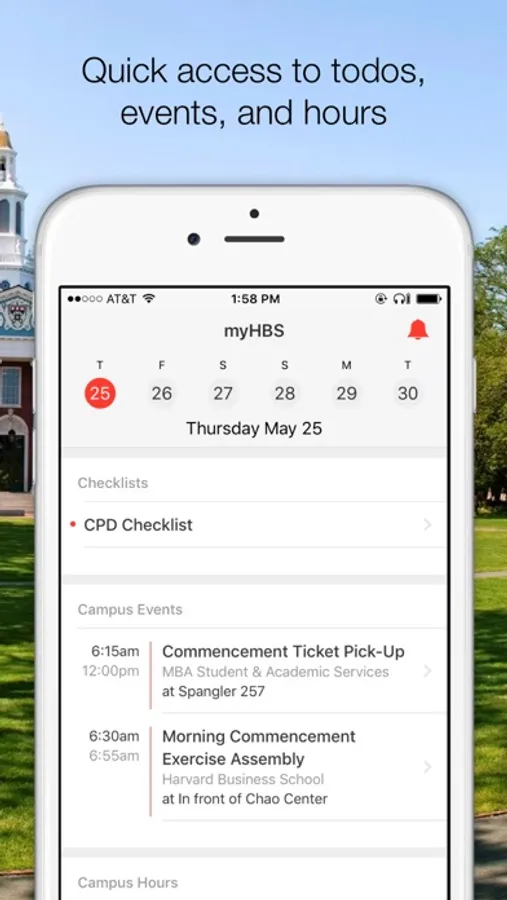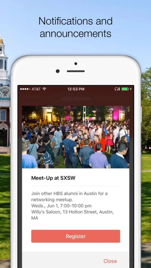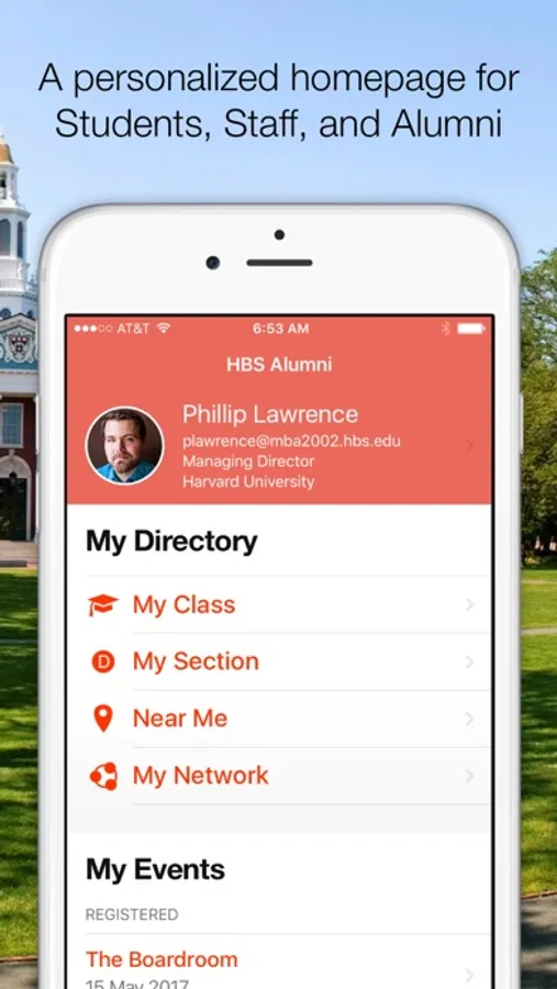 The HBS Mobile App is designed for Alumni, Students, and Staff at Harvard Business School.