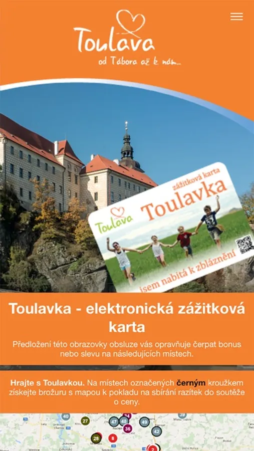 TOULAVKA - zážitková karta turistické oblasti Toulava vám umožní čerpat množství slev a bonusů v památkách, atrakcích restauracích i penzionech od Tábora až po Sedlčany. Stačí se prokázat na libovolném zážitkovém místě úvodní obrazovkou této aplikace a máte nárok slevu nebo bonus čerpat. Seznam všech zážitkových míst a bonusů, které poskytují, najdete v této aplikaci.