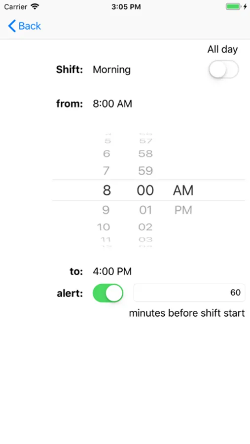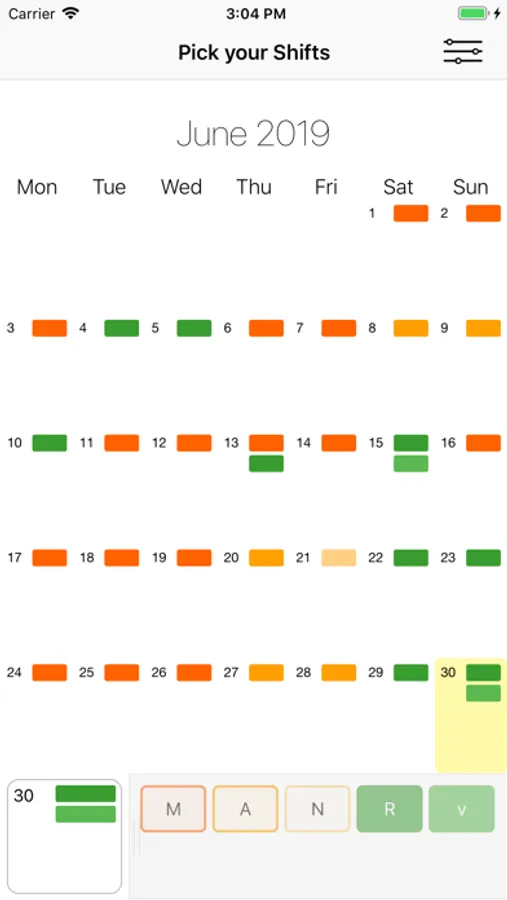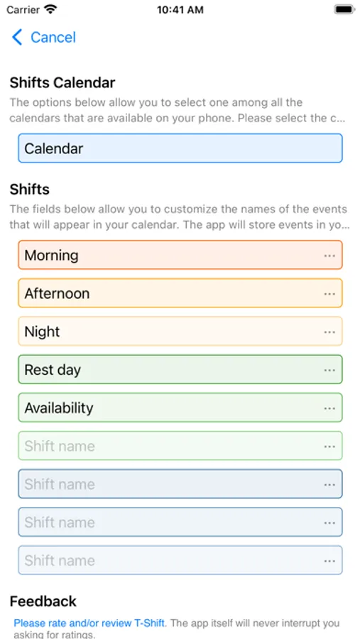 The app is optimised towards fast insertion of the the month shifts. You just select the first day of the month and with a single tap you will be able to add the shift for that day and move to the next day. The shifts you insert in the app are shown in a custom view and synced with your calendar of choice. Shifts will appear in your calendar as events that start and end at the timing you choose or as all-day events.