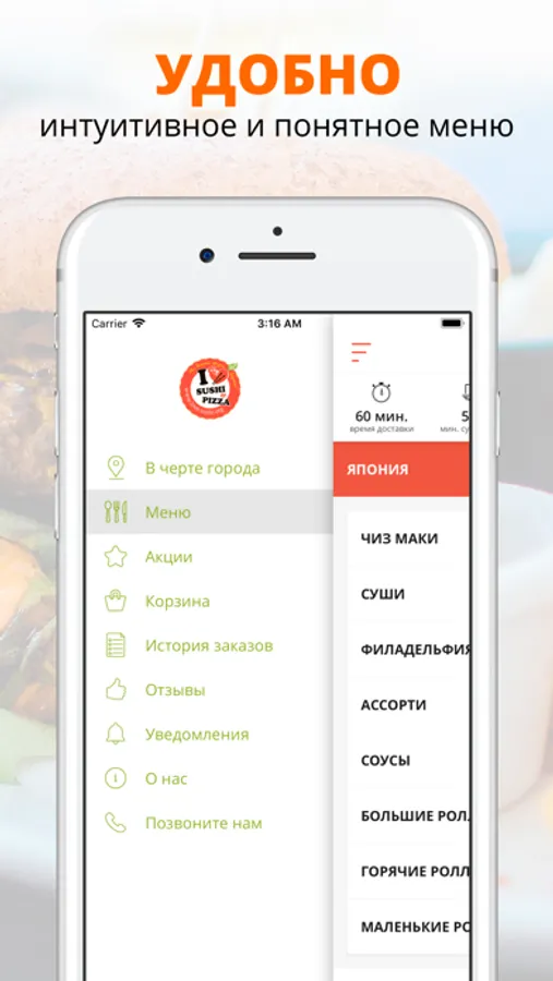 В нашем меню Вы найдете большой ассортимент блюд, приготовленных профессионалами своего дела, а самое главное, что для этого даже не нужно выходить из дома, стоит позвонить или оформить заказ на нашем сайте и в течении 1 часа курьер доставит Ваш заказ.
