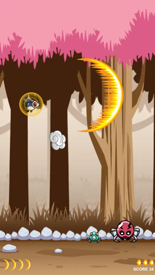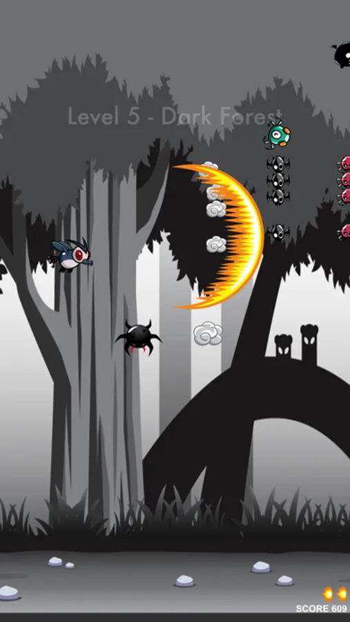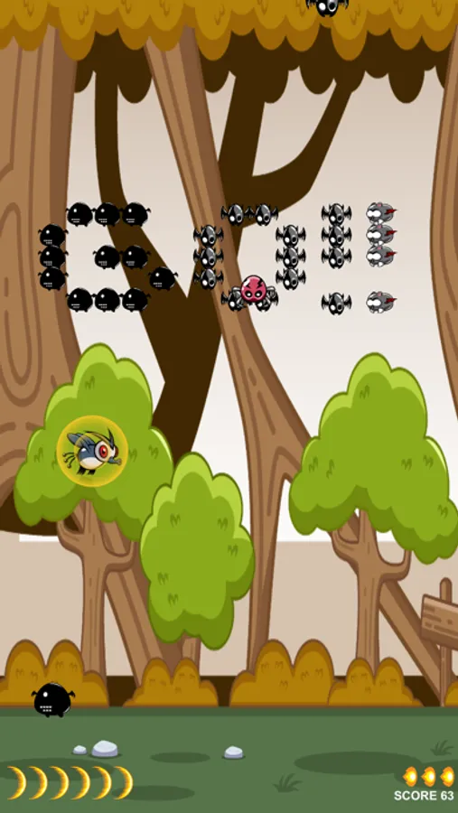 Fly your bug through five forests, avoiding or shooting down spiders and bats. Earn up to 3 simultaneous shots and use 1 huge shot per level.