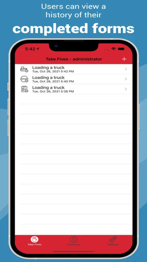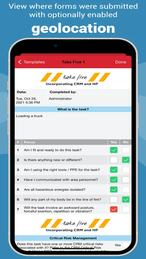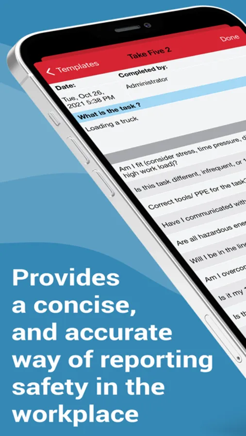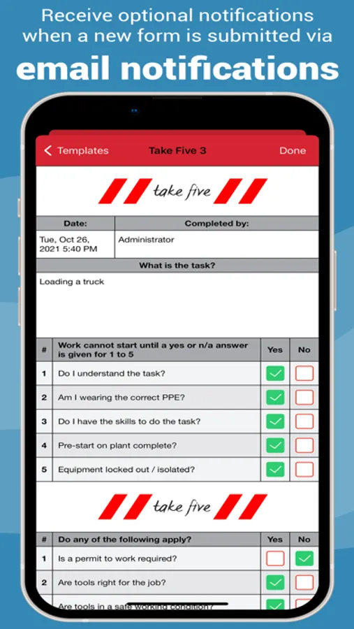The mobile app allows the user to complete a ‘take five’ and have it uploaded to the cloud. It also automatically downloads any new content, such as new or updated ‘take five’ forms, based on configuration changes made in the dashboard app by an administrator.