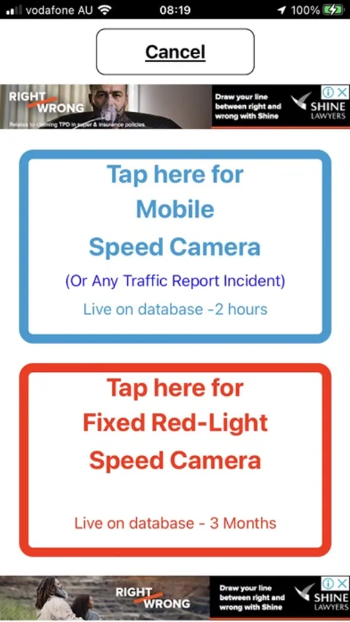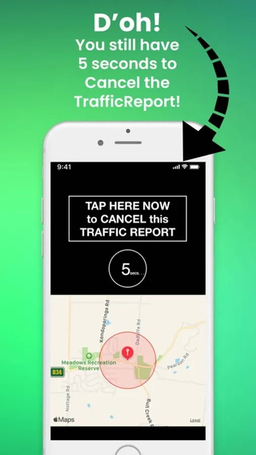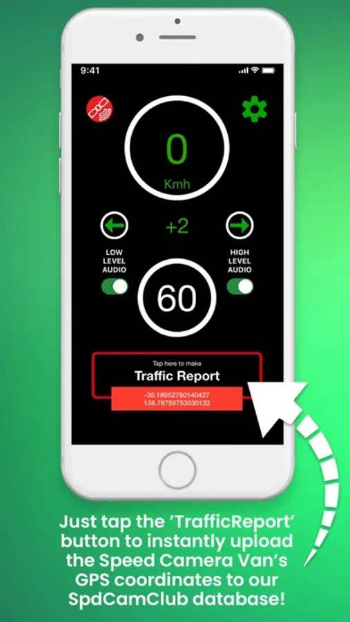 ~ One quick tap of the 'TrafficReport' button instantly sends the location of the unmarked Speed Camera Van - that you've just spotted - to be uploaded to the SCC database.