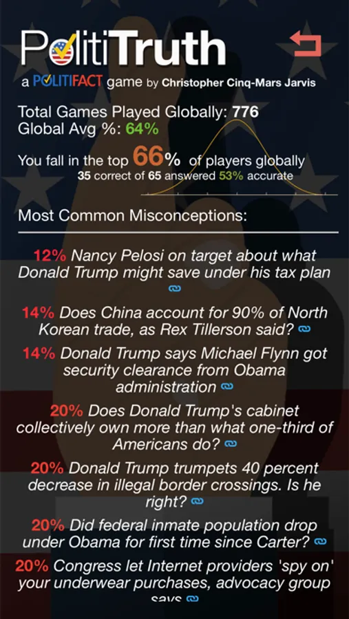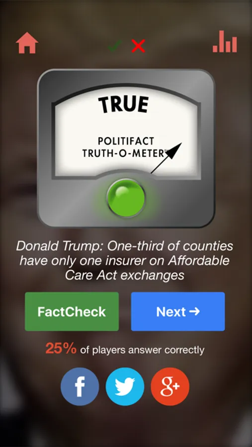 Swipe left to guess a news story is false and swipe right to guess it is true. The game is made in partnership with the Pulitzer Prize winning organization PolitiFact in the hopes of encouraging players to better discern sources of information while gathering beneficial statistics on public misconceptions. By tapping into our competitive nature, we hope to expand political consciousness.