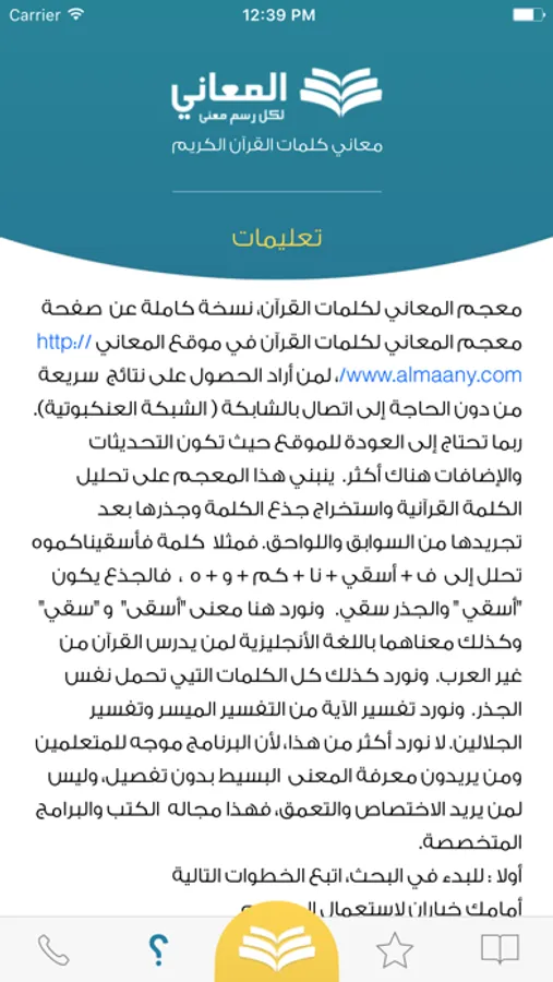 معجم المعاني لكلمات القرآن، نسخة كاملة عن صفحة معجم المعاني لكلمات القرآن في موقع المعاني http://www.almaany.com/، لمن أراد الحصول على نتائج سريعة من دون الحاجة إلى اتصال بالشابكة ( الشبكة العنكبوتية). ربما تحتاج إلى العودة للموقع حيث تكون التحديثات والإضافات هناك أكثر. ينبني هذا المعجم على تحليل الكلمة القرآنية واستخراج جذع الكلمة وجذرها بعد تجريدها من السوابق واللواحق. فمثلا كلمة فأسقيناكموه تحلل إلى ف + أسقي + نا + كم + و + ه ، فالجذع يكون "أسقي " والجذر سقي. ونورد هنا معنى "أسقى" و "سقي" وكذلك معناهما باللغة الأنجليزية لمن يدرس القرآن من غير العرب. ونورد كذلك كل الكلمات التيي تحمل نفس الجذر. ونورد تفسير الآية من التفسير الميسر وتفسير الجلالين. لا نورد أكثر من هذا، لأن البرنامج موجه للمتعلمين ومن يريدون