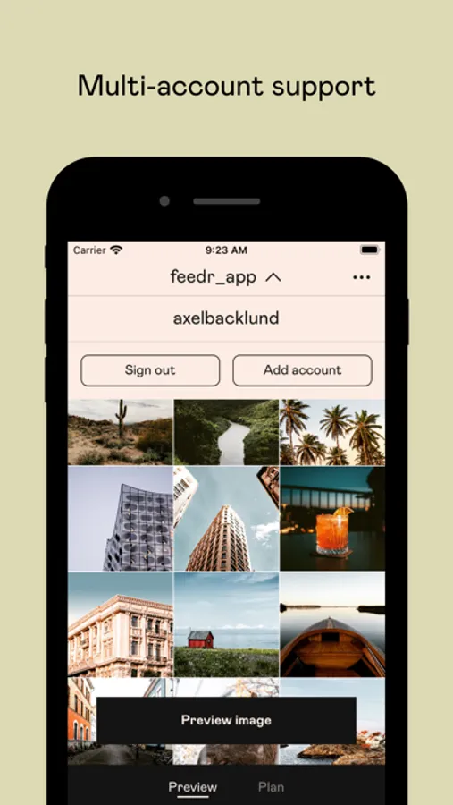 A simple user interface makes previewing quick and easy, and the Instagram login gets your current feed automatically. Feedr also handles your multiple Instagram accounts with multi-account support.
