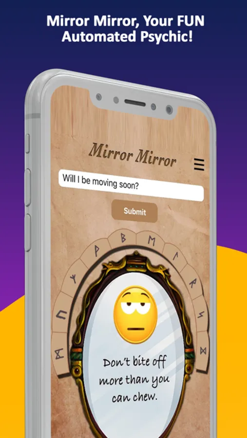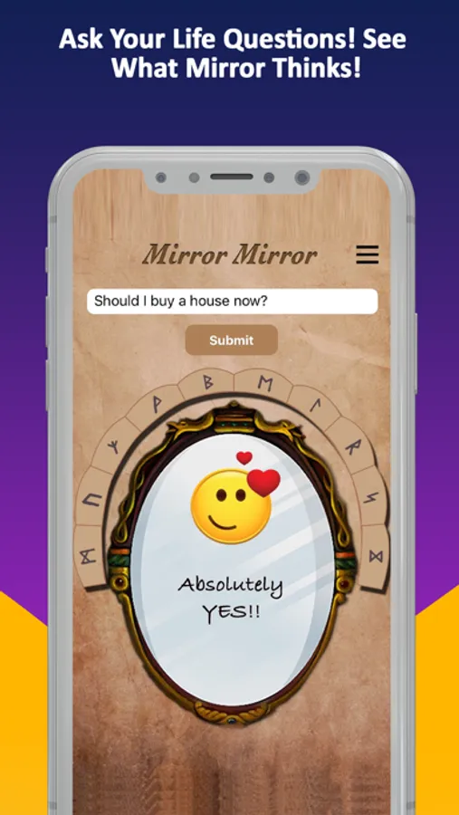 Ask Mirror a yes or no question and a magical face and answer appears in the mirror. Need more life advice or guidance? Ask Mirror another question. Use Mirror Mirror daily to help you through life’s decisions or just to have fun asking it questions! More fun and complex than a crystal ball and way more answers than the magic 8 ball!