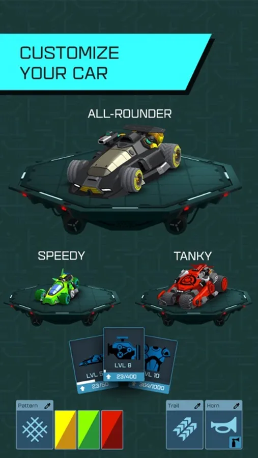 Choose from a pool of cars and select the vehicle that suits your playstyle best! Fast, armored or maybe you prefer an All-rounder? You can customize each vehicle individually! Change anything from your vehicle’s components or colors all the way to designs and start the race with your personal car. Dominate your opponent and mock them with your horn!