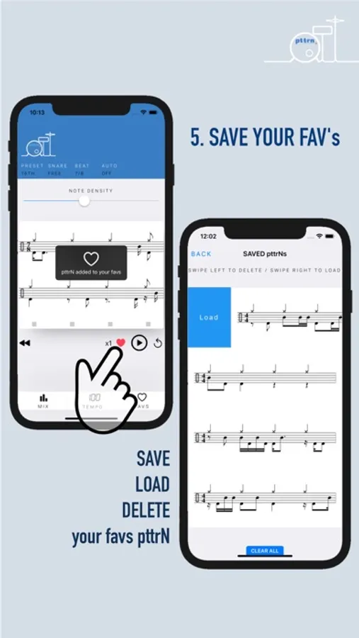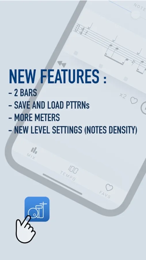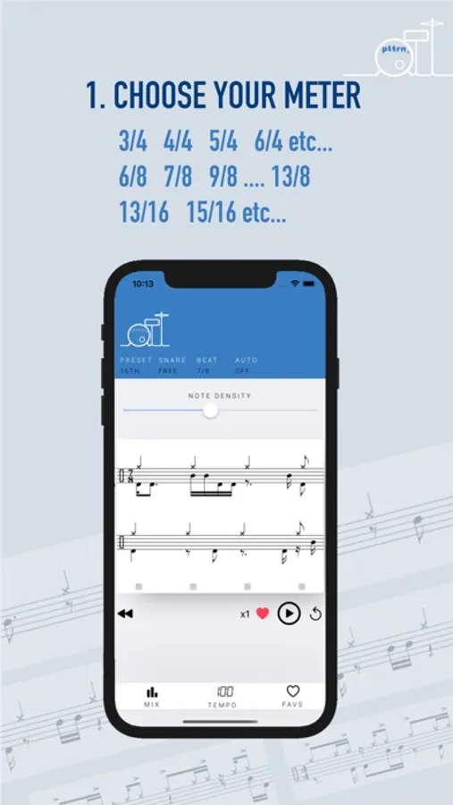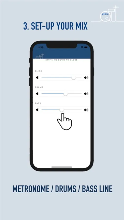 PttrN plays the patterns, and for even more FUN, you can have a virtual bass player ! Set your own mix between the metronome, the drums sound and the bass.
