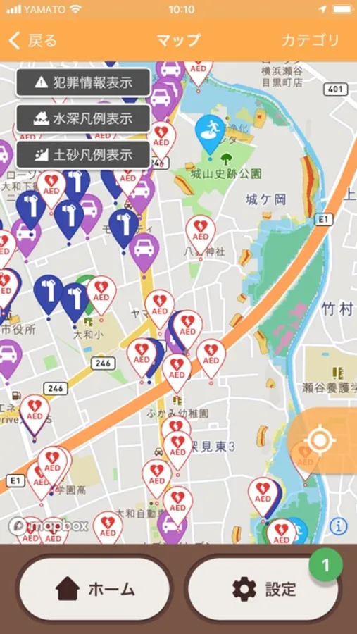 避難所やAEDの場所や経路を確認できます(GPSの機能を有効にしてください)。