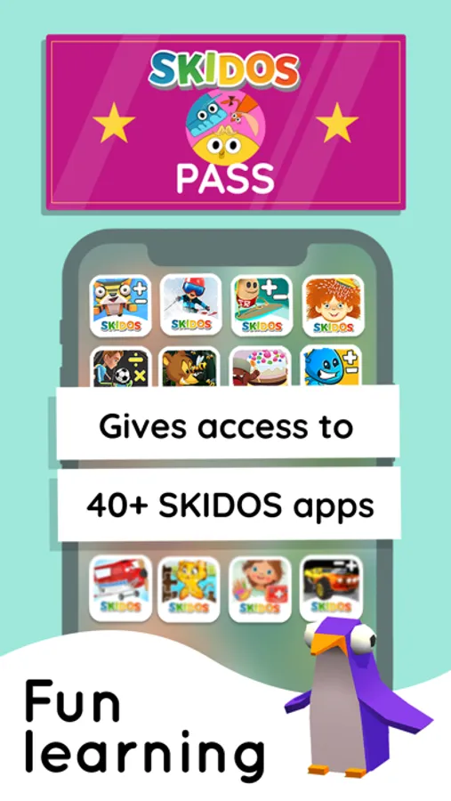 With a single Pass, you access all SKIDOS apps where children of different ages will find games to every taste. You can create up to 6 player profiles within one account and log in from multiple devices. Go ahead and customize the app experience for your kids according to their interests and learning level. Stay on top of how your kids learn - check the progress report in the app or via email.