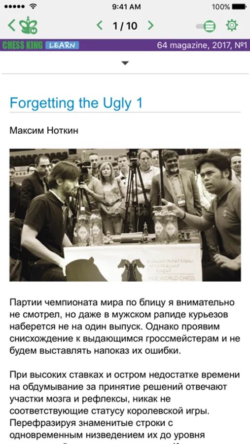 "64 - Chess Review" is Russia's most popular chess monthly, in print since 1924. Known for high quality articles and deep game analysis. The magazine is now going mobile. The new digital format is at its best when it comes to chess problems and positions, which you can now analyze in a special mode. The most peculiar positions from articles are now available as chess puzzles in a separate section.