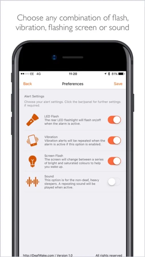 The App has an easy interface where you can select the camera flash, have a flashing screen, have it vibrate or use sound. You may select one or two or even use all the senses of your iPhone.