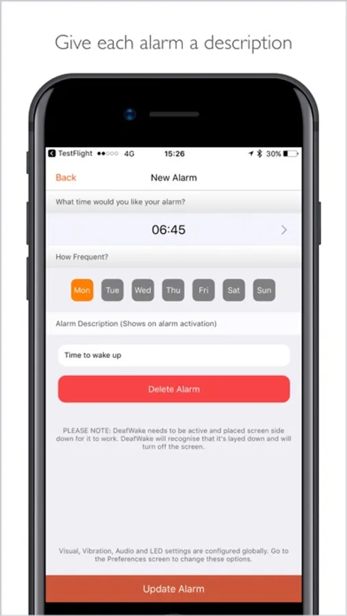 As a long life deaf person I have been frustrated with the lack of innovation designed for deaf people in technology. One problem I have had is a suitable alarm clock or timer that appropriately notifies me. This App was born out of frustration and was initially just developed for my own personal use.