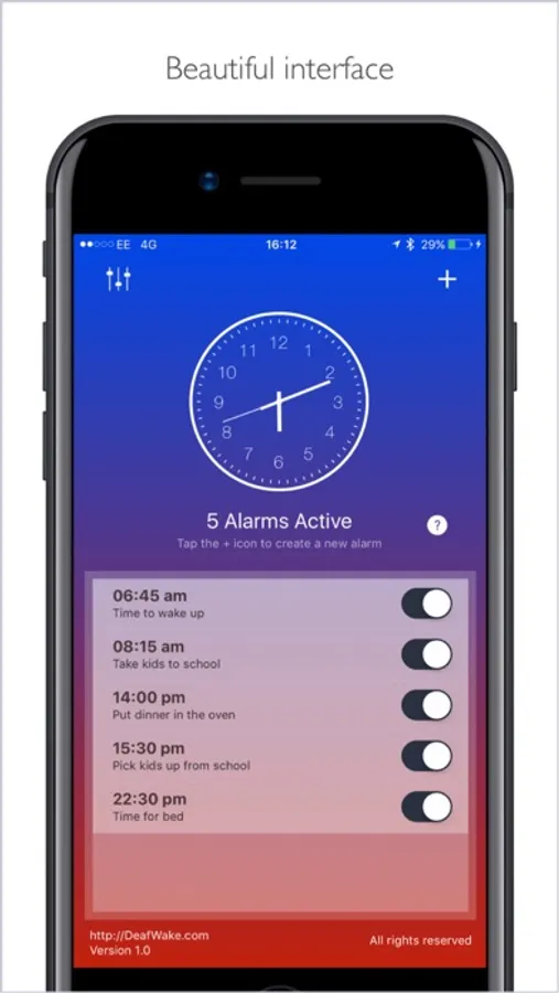 No longer do you have to put the phone under your pillow or in your pocket in order to (hopefully) be woken up. At night put the iPhone at the side of the bed and let it flash to wake you up (using the flashing screen and camera flash). Put the iPhone on the kitchen table whilst chopping carrots to remind you to take the roast out of the oven. Settle down, watch a movie and let the App tell you when its time to go to bed.