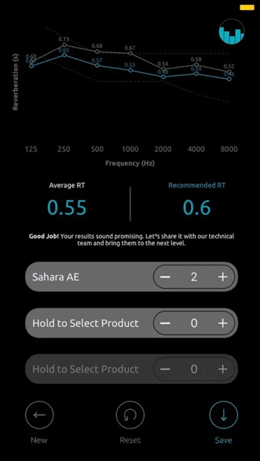 Impulso Pro is a room acoustics measurement and analysis software. It allows you to measure the acoustic response of your room using your iPhone. You can visualize the measured reverberation time (RT) in octave bands and then simulate how the acoustic response of your room will be improved when adding artnovion acoustic products. You can enter room dimensions and select the type of room you are designing for. The app will then offer guidelines for the expected RT and you can select products to optimize the response accordingly.