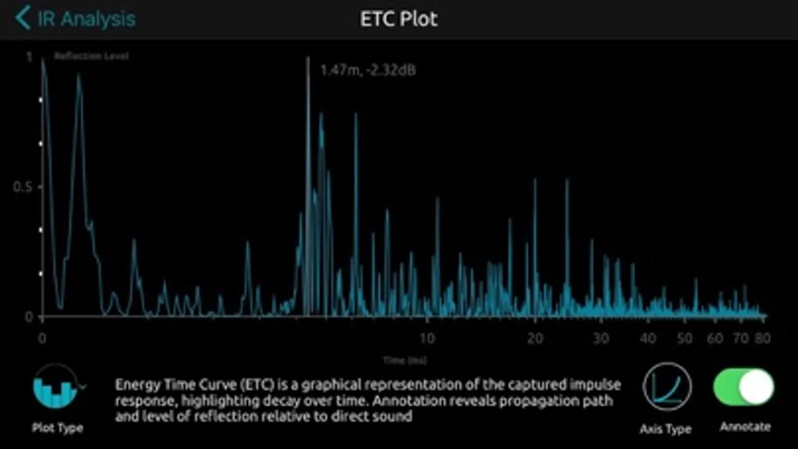 Impulso Pro also provides detailed plots of energy time curves, to check for undesirable reflections, a frequency plot, which you can zoom in and a table with the acoustic parameters of your measurements such as C80, D50, STI and Bass Ratio.