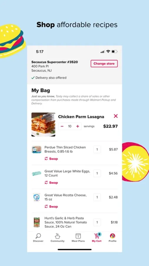 Shoppable Recipe Integration: Shop for affordable recipes and get your groceries delivered or picked up through Walmart, saving you both time and money.