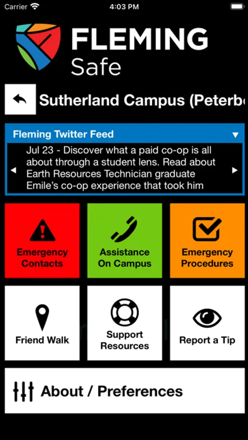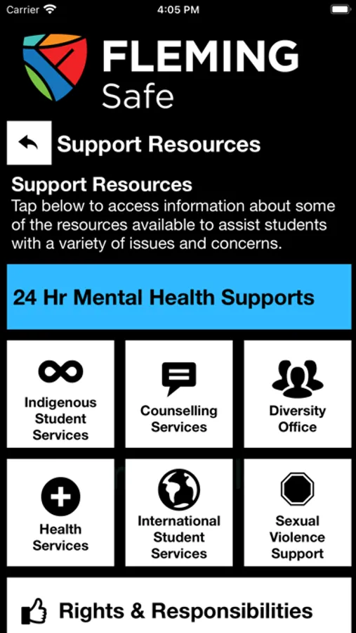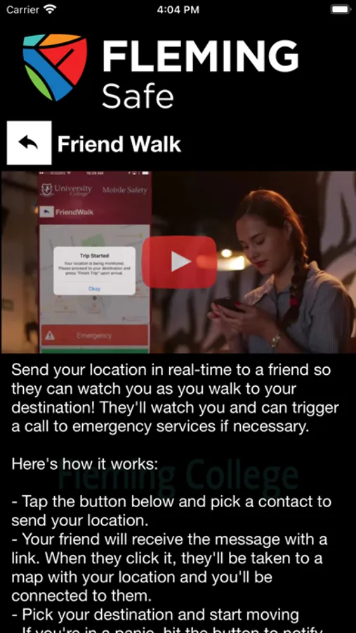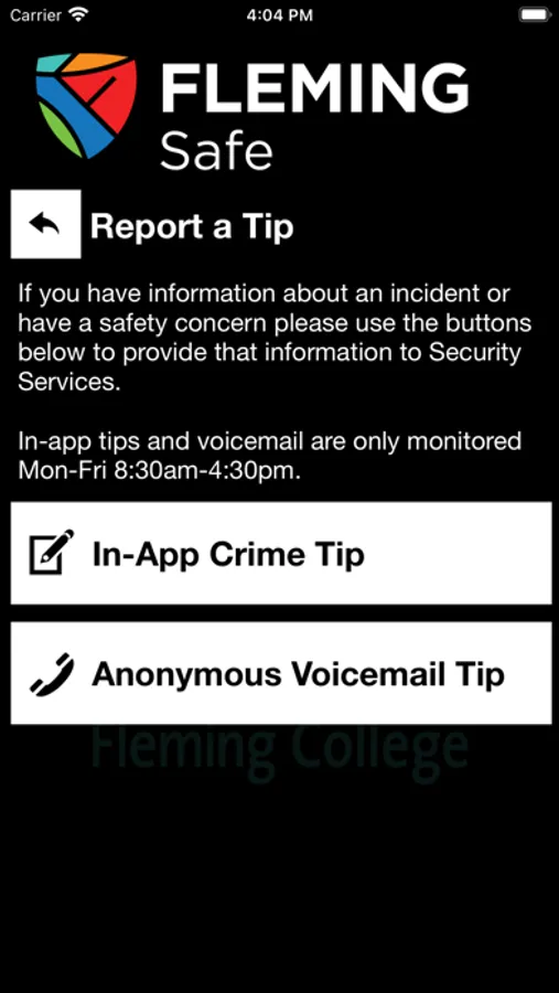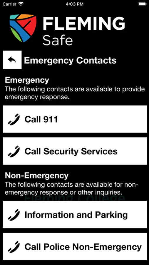Fleming Safe is an essential tool to enhance your safety at Fleming College. The app will send you important safety alerts and provide instant access to campus safety resources. Fleming Safe is the official mobile safety app of Fleming College.