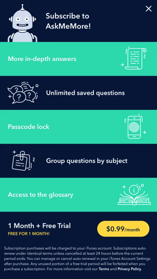 If you choose to purchase AskMeMore!, payment will be charged to your iTunes account. Subscriptions auto-renew under identical terms unless cancelled at least 24 hours before the current period ends. You can manage or cancel auto-renewal in your iTunes Account Settings after purchase. Any unused portion of a free trial period will be forfeited when you purchase a subscription. For more information visit our Terms and Privacy Policy. Current AskMeMore! subscription price starts at $0.99 USD/month. Prices are in U.S. dollars, may vary in countries other than the U.S. and are subject to change without notice. No cancellation of the current subscription is allowed during the active subscription period. If you don't choose to purchase AskMeMore!, you can simply continue using AskMeMore! for free.