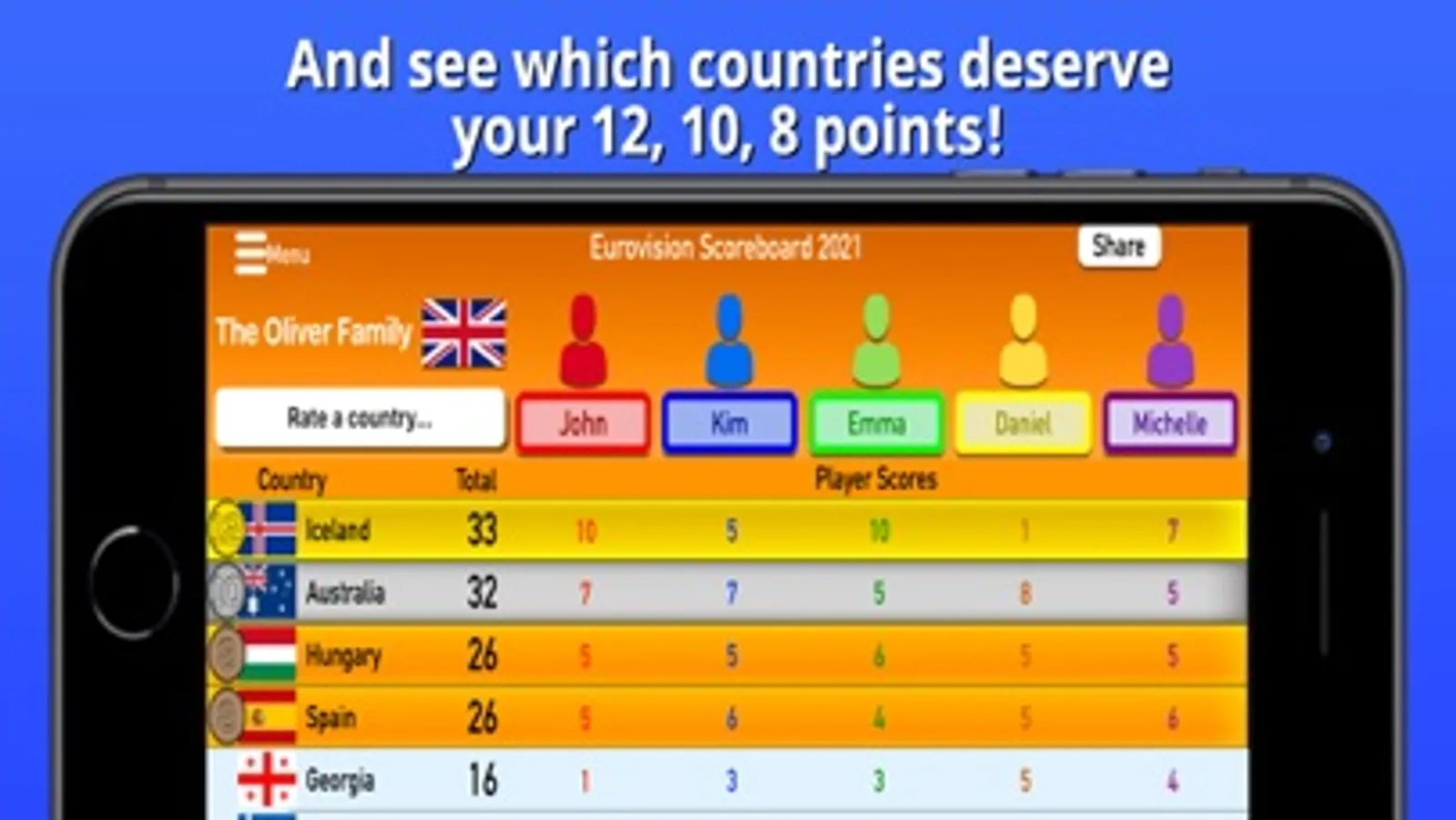Each person can rate every act from 0-10 as they perform. All of the individual scores are combined to give each country a total score from your group of friends and family. As countries are added to the scoreboard, you will get a clear picture of which countries have earned your family's/friends' 12, 10, and 8 points!