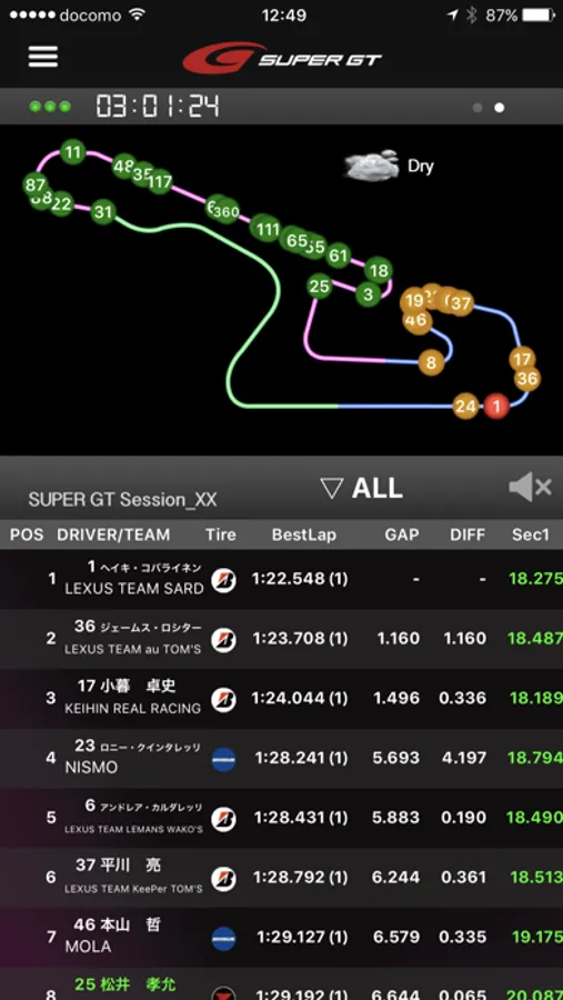 Not only the live timing but also the location information of the car is displayed, and all the lap information of all cars is also delivered.