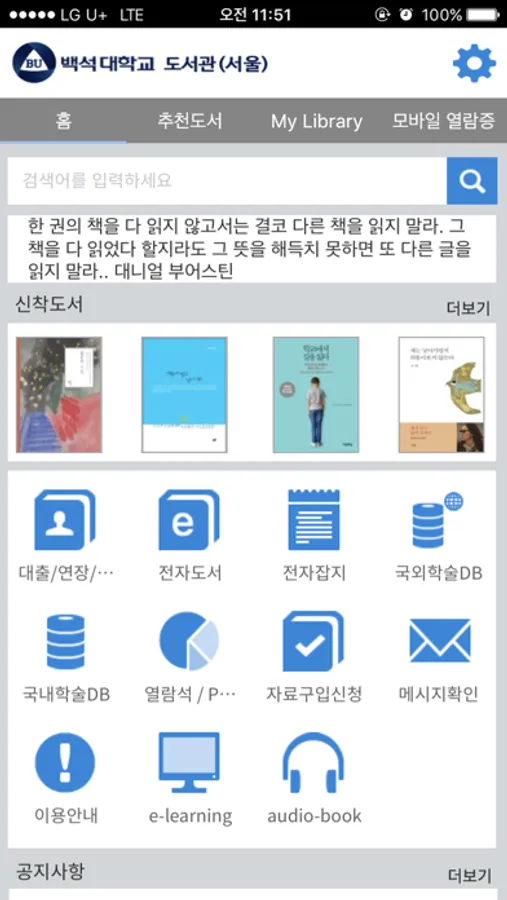 백석대학교 도서관(서울)은 모바일 앱(APP)을 개발함으로써 iOS를 통한 서비스를 제공하게 되었습니다. 앱(App)을 통해 도서관소개, 이용안내, 통합검색, 대출조회 및 연기신청, 예약 등 도서관에서 제공되는 모든 서비스를 동일하게 이용할 수 있습니다.