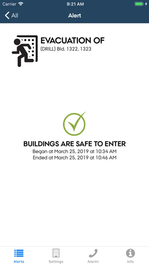 The app keeps you up-to-date with how the event develops and notifies you when it is safe to return to the building.