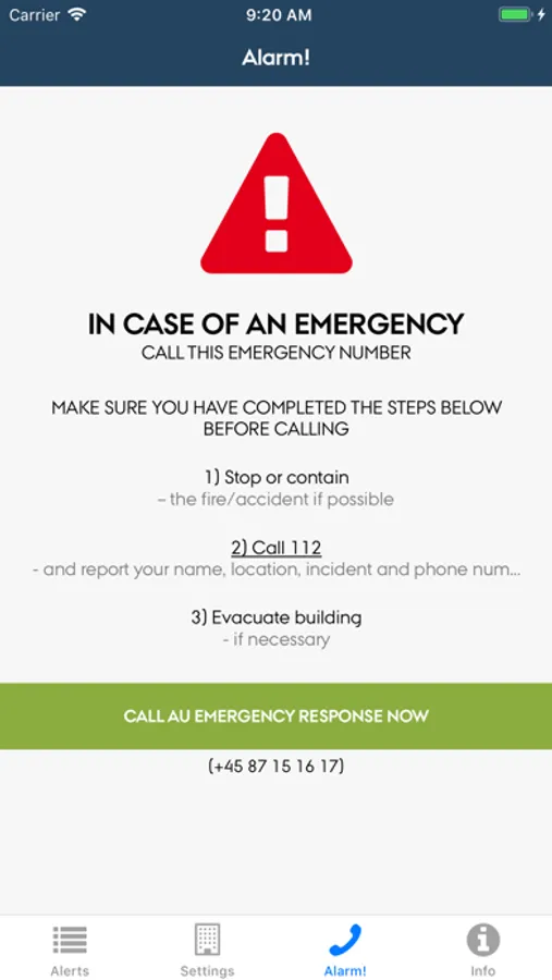 AU Evacuate is an app that warns you in the event of evacuations in and around the buildings at Aarhus University. In the app you can see in which specific areas the app is used. The app warns you directly with an alarm sound on your smartphone.