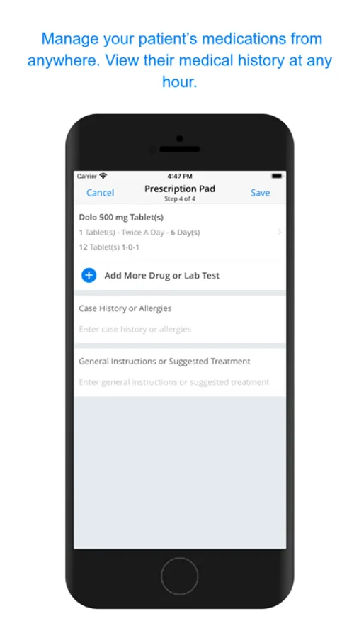 Manage your patient’s medications from anywhere. View their medical history at any hour. Send e-prescriptions instantly via WhatsApp or Email.