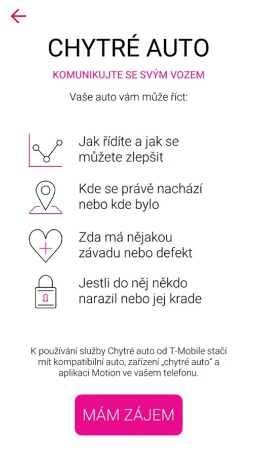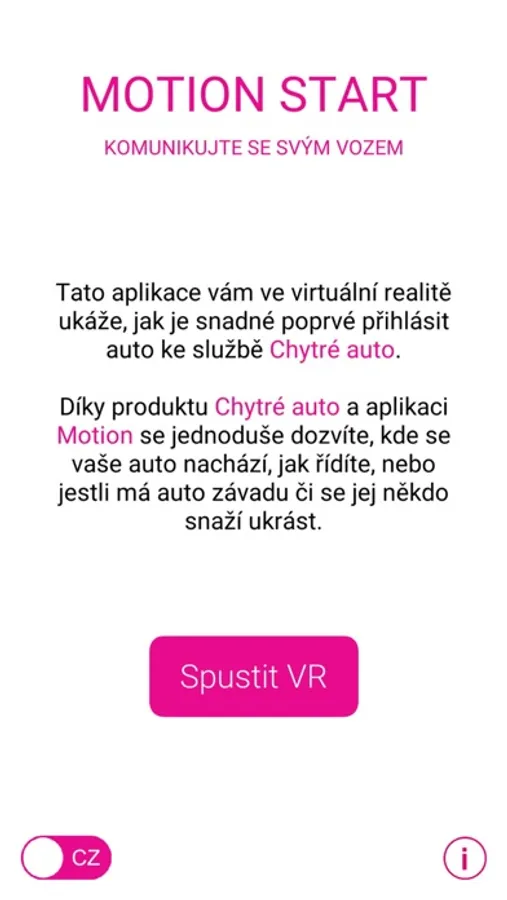 V aplikaci Motion Start si sami vyzkoušíte, jak snadné je propojení auta se službou Chytré auto. Aplikace Motion Start simuluje zapojení zařízení Chytré auto do OBD portu, přihlášení do aplikace Motion a následně použití služby Chytré auto při jízdě, to všechno pomocí virtuální reality. Pro spuštění aplikace použijte brýle pro virtuální realitu (např. cardboard).