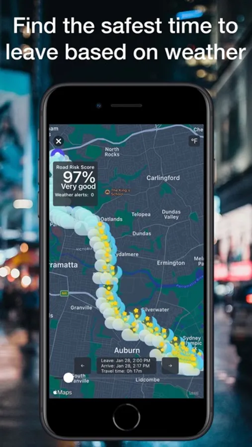 Weather Forecast Along Your Route shows the weather forecast at the expected time at each point of your route or road trip.