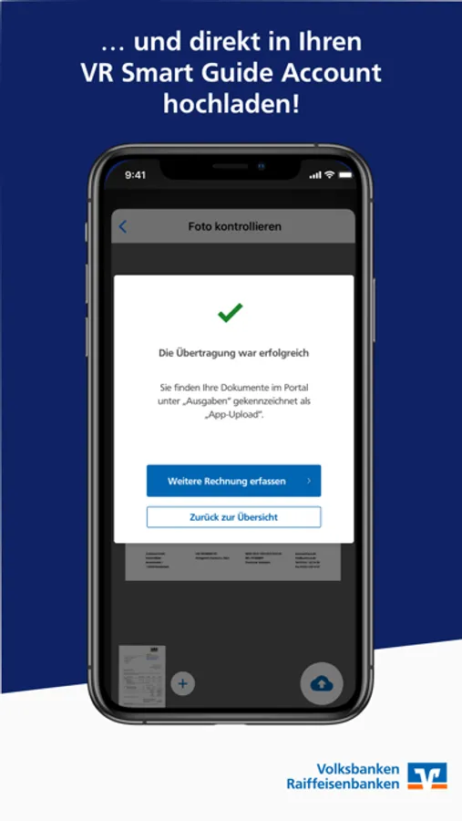Ihre fotografierten Rechnungen werden automatisch in Ihren VR Smart Guide Account hochgeladen und als Entwurf angelegt.