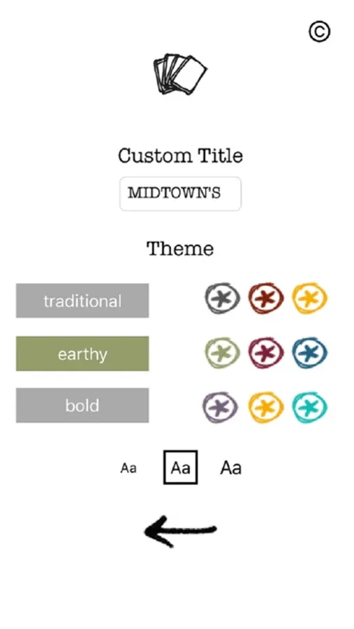 Enjoy the ability to customize your virtual deck of cards by using the settings wheel at the top right-hand corner of the screen to select one or more categories of questions. Use the settings wheel again to change the Custom Title, select a Theme (traditional, earthy or bold), and choose a Custom Font size (small is recommended for iPhone 5s®, large is recommended for iPads, and medium for all other Apple devices.) Default font size is medium.