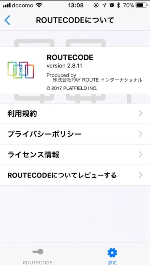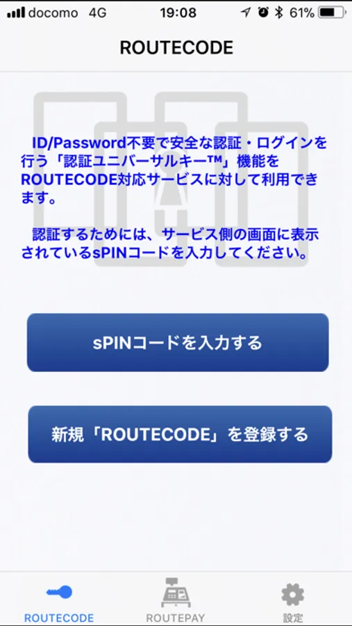 *ROUTECODE認証...株式会社PAY ROUTEインターナショナルが提供する認証サービス。本アプリに「認証キー」という鍵を作成し、それを用いた認証を行うことで、従来のワンタイムパスワードやID/Passwordによる認証よりもはるかに簡便でセキュアな認証を実現します。unID認証サービスと互換性がありますので本アプリはいずれの認証サービスにもご利用頂けます。