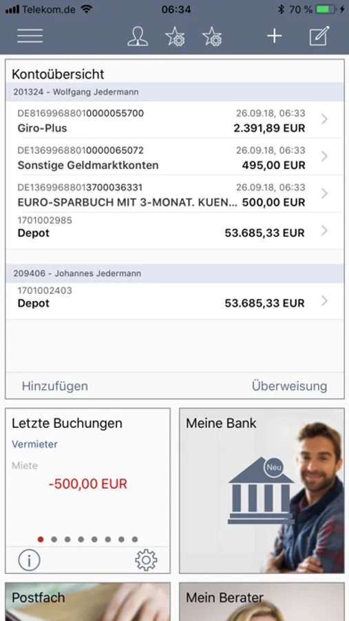 Sie möchten unterwegs mal eben den Kontostand abrufen, kurz die letzten Umsätze der Kreditkarte prüfen oder eine dringende Überweisung erledigen? Kein Problem mit der MyBanking Classic. Besonders praktisch: legen Sie Ihre beliebtesten Funktionen als Favoriten an. Mit der MyBanking Classic steuern Sie sämtliche Konten – auch von anderen Instituten. Und sind so höchst flexibel in Ihren Bankgeschäften. Selbstverständlich gelten die Sicherheitsstandards für alle Bankverbindungen.