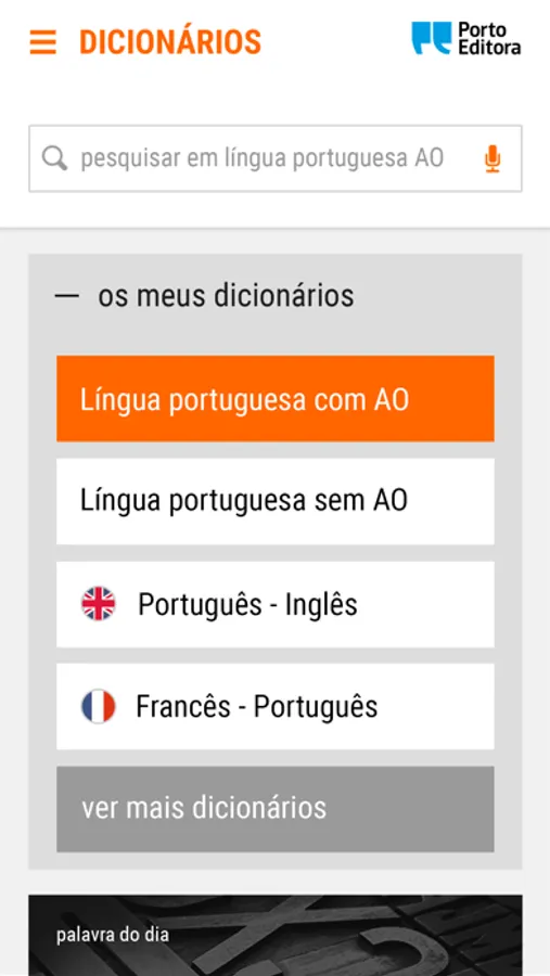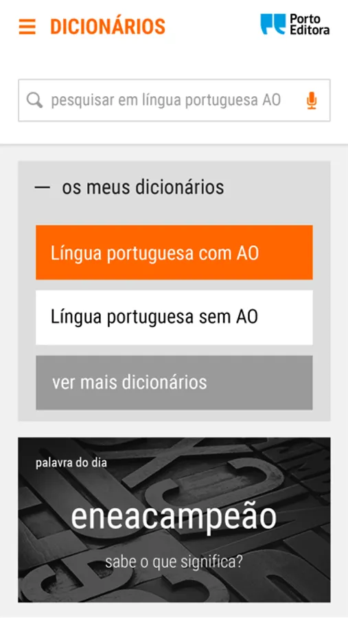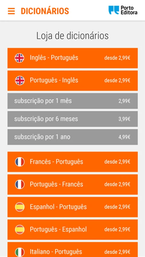 Esta app disponibiliza, gratuitamente, os dicionários da Língua Portuguesa com e sem acordo ortográfico. Em regime de subscrição, sem publicidade, com durações de 1 ano, 6 meses e 1 mês, estão disponíveis os seguintes dicionários: