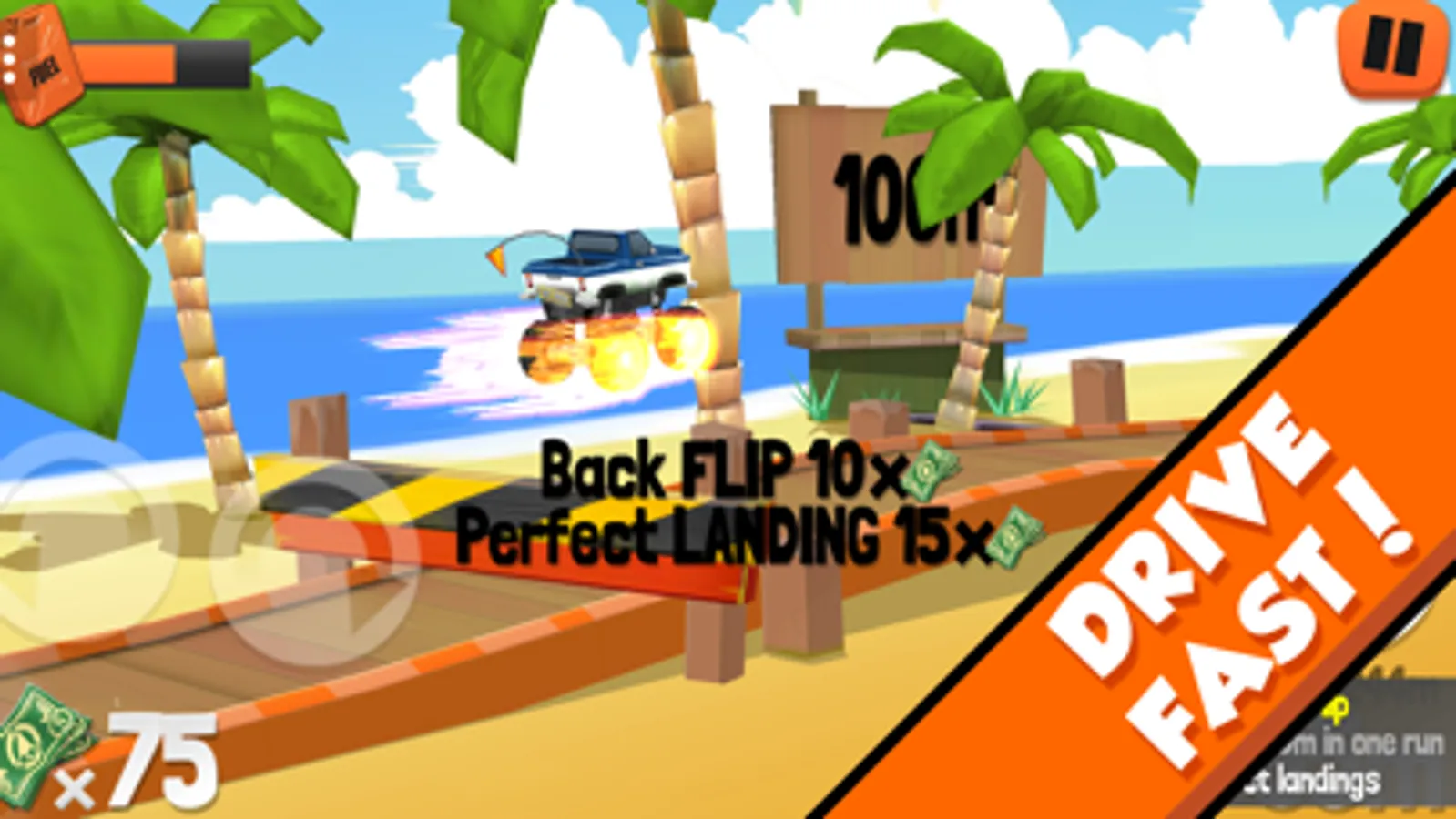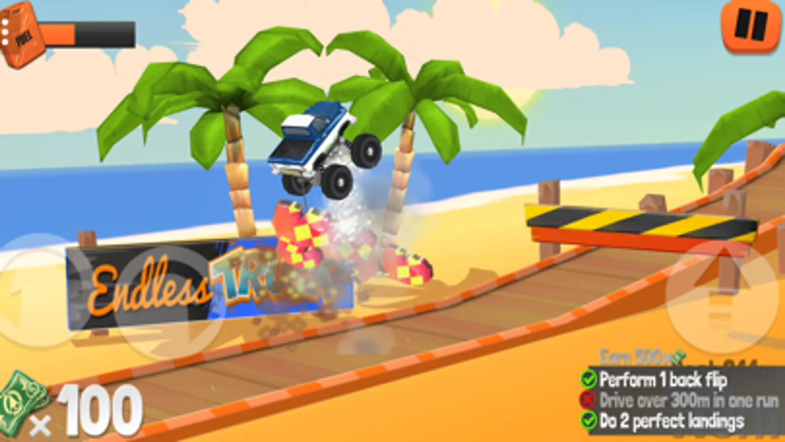 This is not a parking game! It’s a racing game! Fasten your seatbelt in this skill racer and race your Monster Truck as far as you can, collecting money, pulling off the biggest jumps, doing insane flips, avoiding gigantic bombs and make sure you don’t run out of fuel. If you do, you go back to the start and use the collected cash to upgrade your truck with new tyres, a bigger engine or a bigger tank and try again. You can improve your vehicle in five areas. The better your truck, the farther you will be able to go. And since this endless racer features an online leaderboard you will want to be on top of that, don’t you? Find out how good you are with the brand new free Endless Truck app.