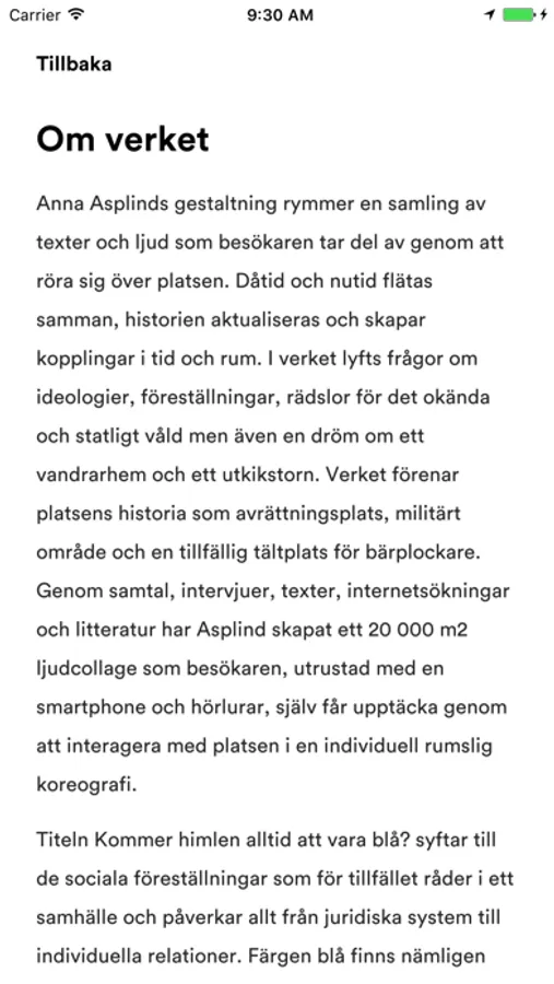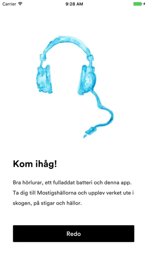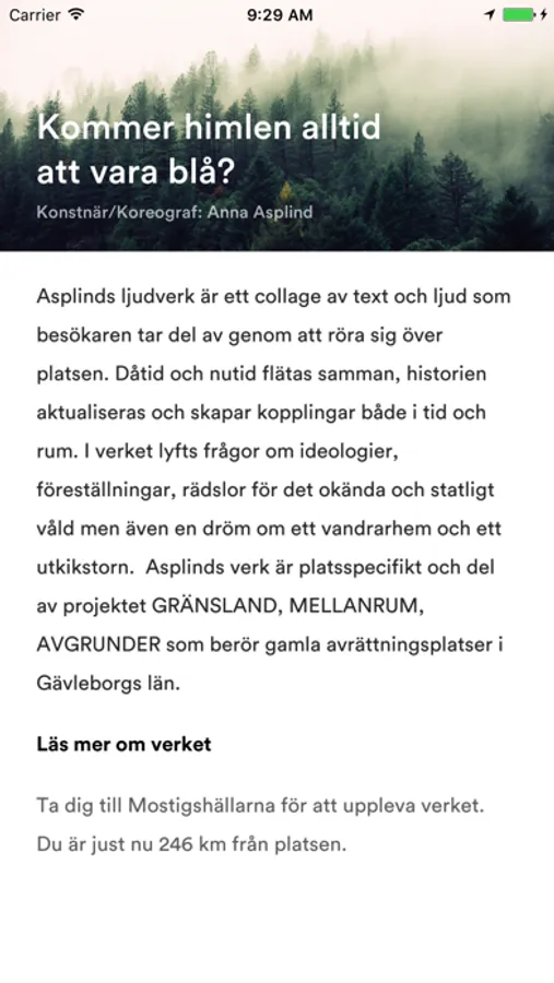 Se till att förbereda dig med bra hörlurar, fulladdat batteri och ha denna app nedladdad. Därefter tar du dig till Mostigshällorna där du upplever verket ute i skogen, på stigar och hällor.
