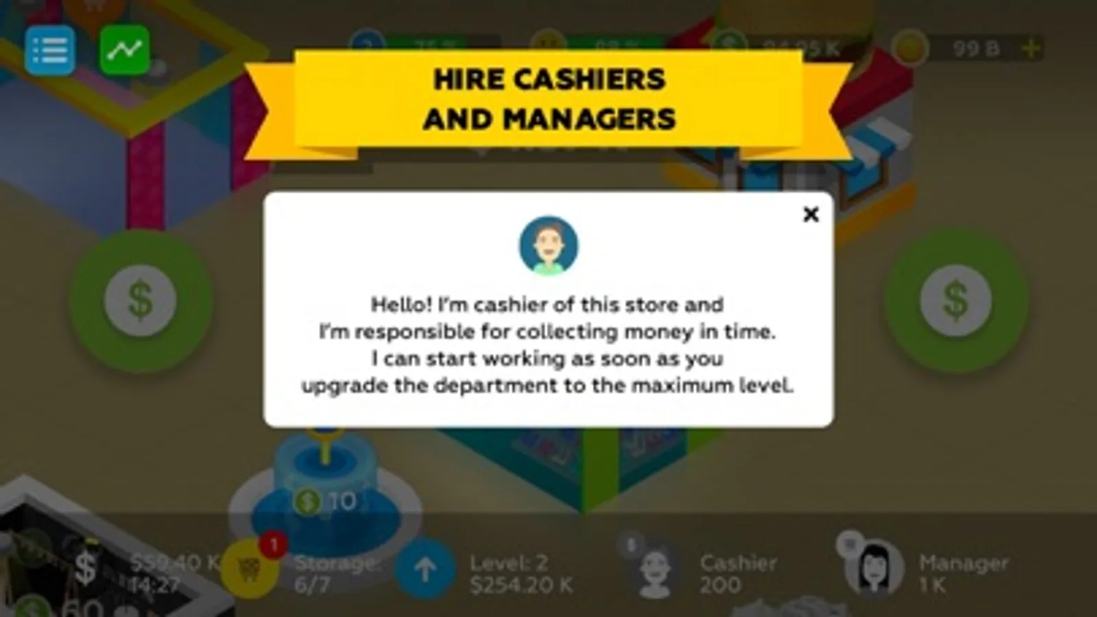 Welcome to the business world! Want to test your skills and become the owner of prosperous mall? Then let's begin! Make the abandoned trading center popular again, attract new customers, hire more professionals, and expand your business. But don't forget that time is money, so don't waste it!
