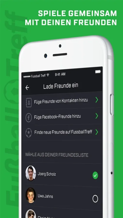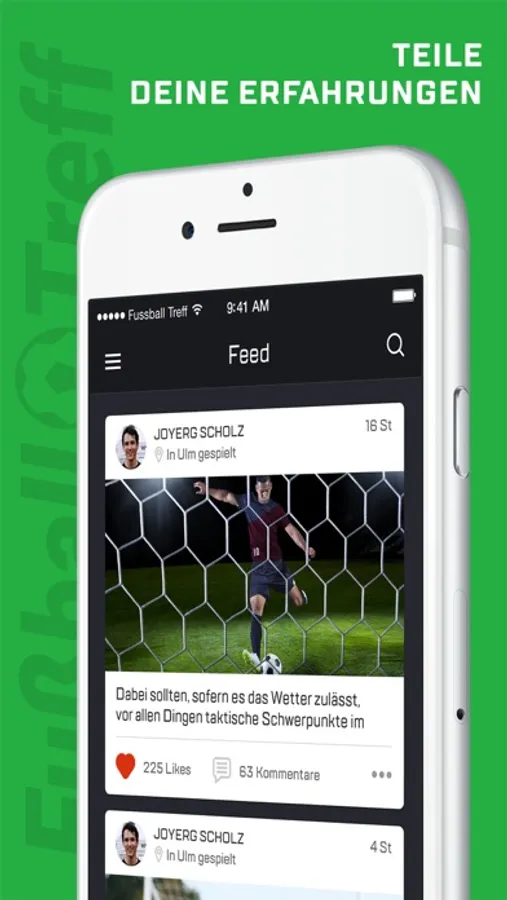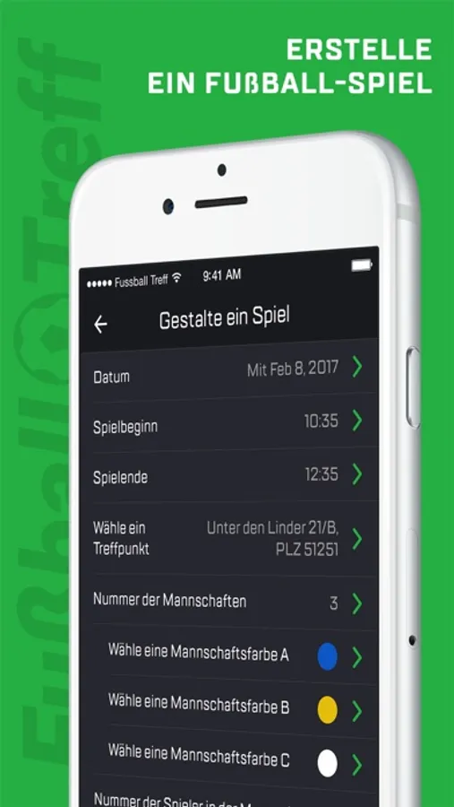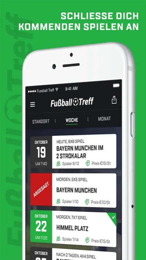 Fussball Treff allows you to easily organize a soccer game with your friends and other players in your neighborhood. With our free app there is no more need in calling or messaging your friends one by one. Don't worry if some of your friends are not available for the match - there are plenty of other community members who can join you. Simply create a game in the app and invite your friends from Facebook or Contacts book. Share your match experience, browse through your play history, follow your teammates, build your network of soccer players and easily find people to play with whenever you want.