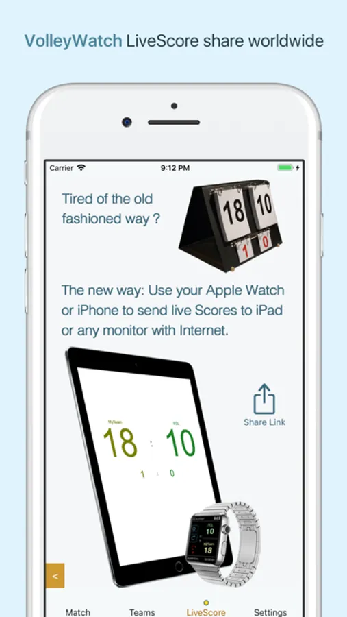 For example, if you organise a tournament - you can now easily show Volleyball Scores live on an iPad or any big Screen of choice that is connected to the internet. All you need to do is to send the LiveScore-Link from within the App. That way, your tournament spectators - as well as friends and family at home - can follow your Scores.