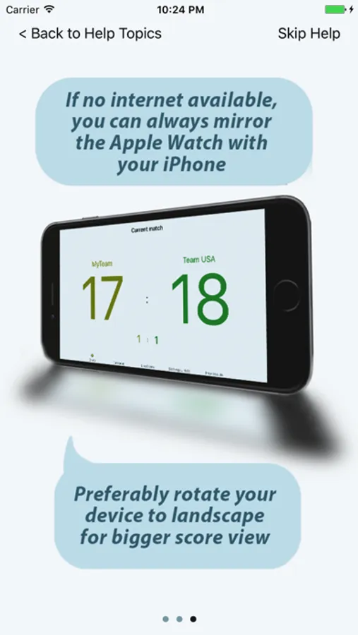Score-entry can be done by tapping on the Apple Watch or on the iPhone score panel. The Scores are mirrored immediately to the other device using Watch Connectivity (no internet needed in this case). The iPhone is used to enter new team-names to a local database on the iPhone that is automatically synchronised with the Watch also using WatchConnectivity.
