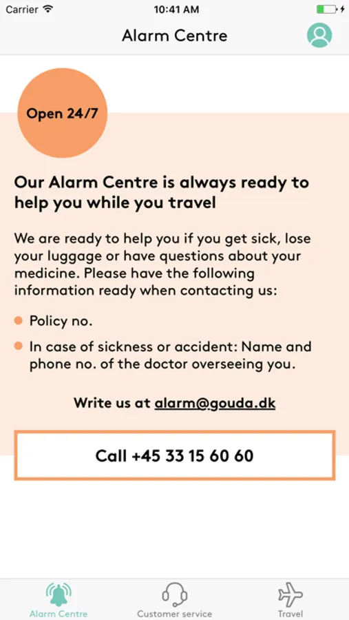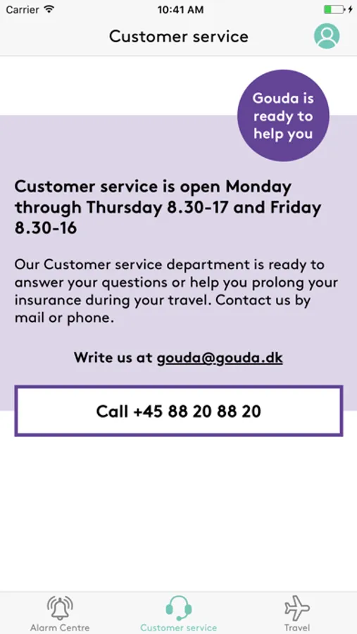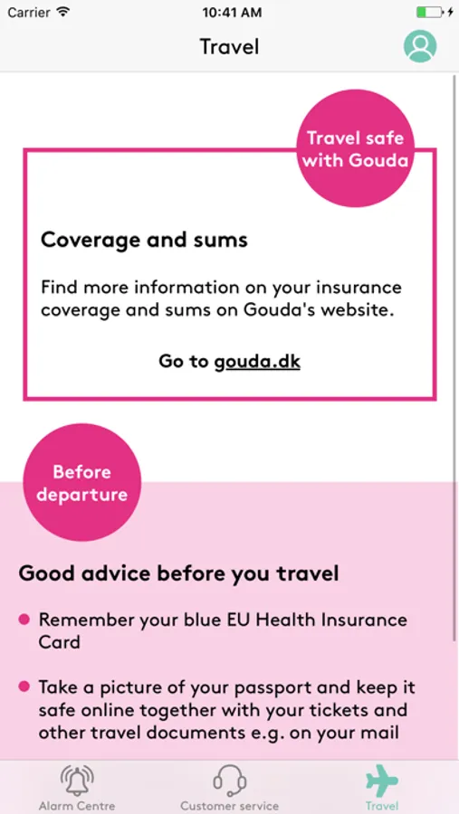 No matter where in the world you are, help is always close at hand with Gouda’s app. The app provides you with your insurance card with all your policy details right at your fingertips, and with a single touch you can call Gouda’s Alarm Centre ready to help you 24 hours a day, should you need any assistance.
