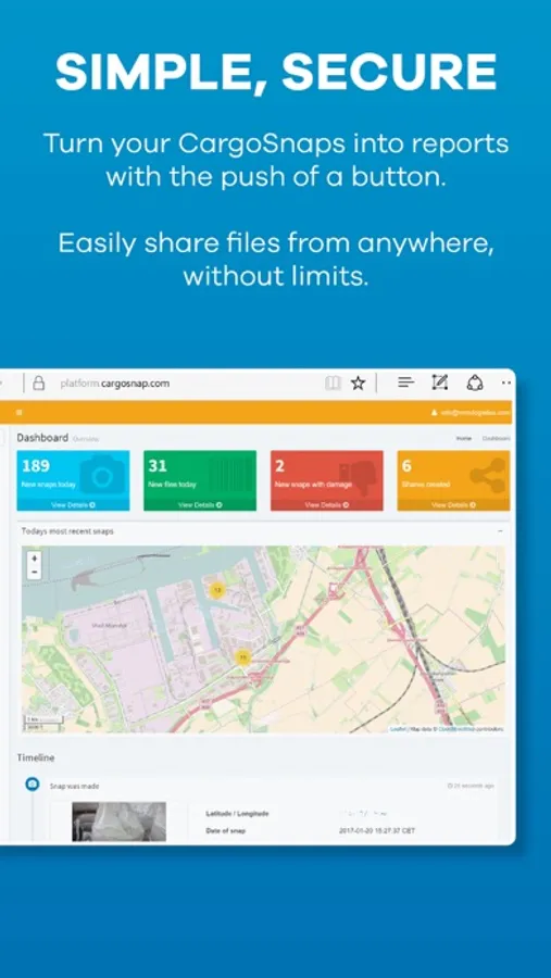 - CargoSnap shows a wealth of information about the whereabouts and state of your products. Sharing photos of the products in different places & moments in the supply chain gives you and your client a better understanding of the current status and location of their products. This will give you and your client better insight into where in the logistics chain any problems occur. In addition, this customer-and service-oriented way of working will help you achieve a higher customer satisfaction.