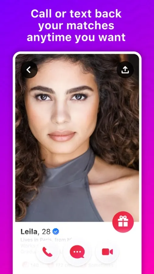 If you like someone, you can easily show your interest by Liking them, and if they Like you back, you have yourself a new opportunity to have fun. With our dating app, you can easily break through the inhibitions of meeting new people in real life by talking on video first! You can also send text messages, pictures and videos, Gifs, Stickers, and Doodles.