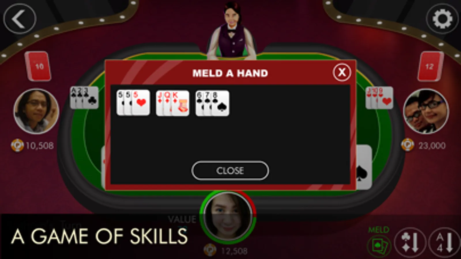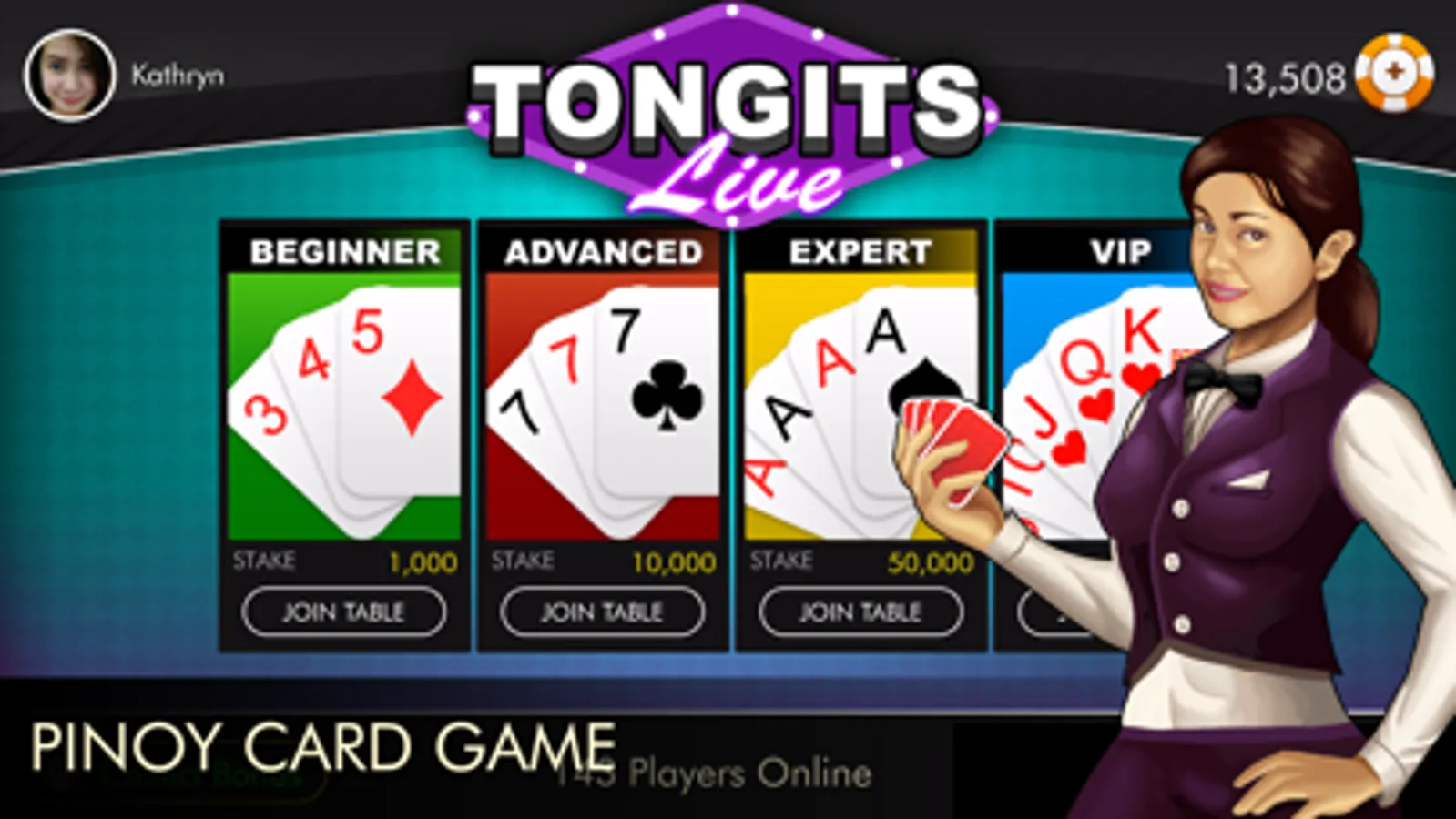 Tongits is a 3 player rummy type of game that became popular in the Philippines. This game is played using the standard deck of 52 cards. The objective of the game is to empty your hand of all cards or minimize the count and the scores of unmatched cards that are still on the player’s hand by forming Melds or card sets, dumping cards and calling a Draw or Fight. The player who gets rid of all the cards or has the least number of total points at the end of the game wins the game.