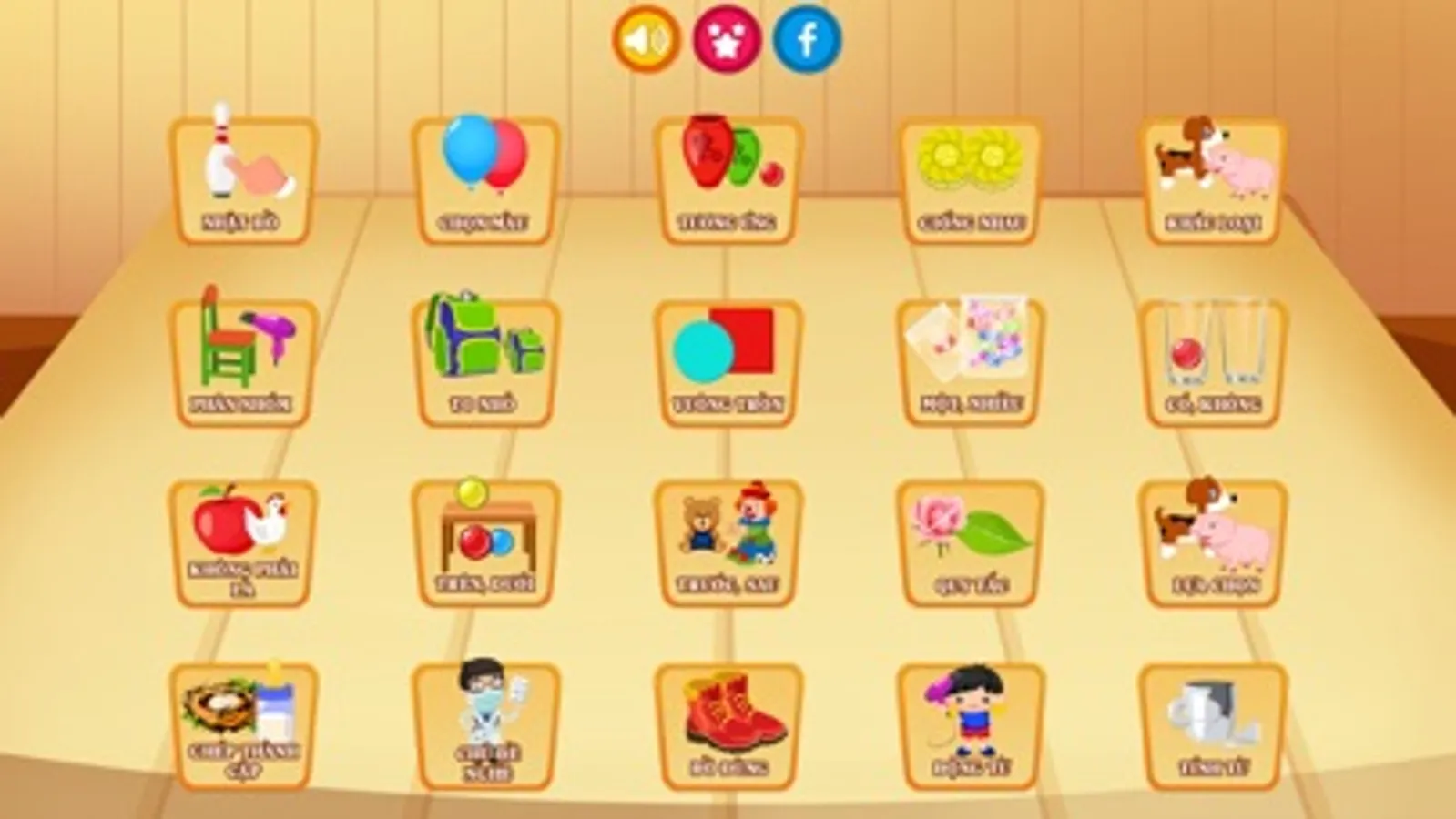 Xin giới thiệu tới quý thầy cô/ cha mẹ phần 1 bao gồm 20 game với nhiều cấp độ từ dễ đến khó giúp thầy cô/ cha mẹ cải thiện kỹ năng của bé như sau: