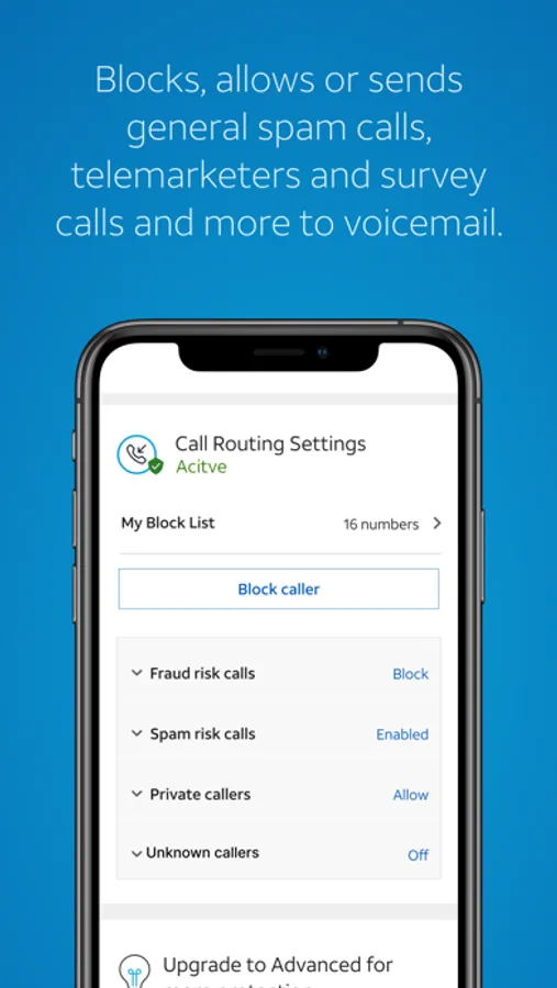 Requires download of ActiveArmor App & acceptance of terms of service and a compatible device running iOS13+. Data charges may apply to app download/usage. Eligibility: Consumer and business wireless accounts with eligible service and AT&T HD Voice-enabled device. Non-AT&T Customers: The following features are only available to AT&T customers: Auto-Fraud Call Blocking, Spam Risk Labeling & Blocking, Nuisance Call Alerts, Nuisance Call Controls, Unknown Calls to Voicemail, Personal Block List, Caller ID. Some features may not work while roaming internationally. Details at www.att.com/activearmor For complete terms for AT&T ActiveArmor, see Details at