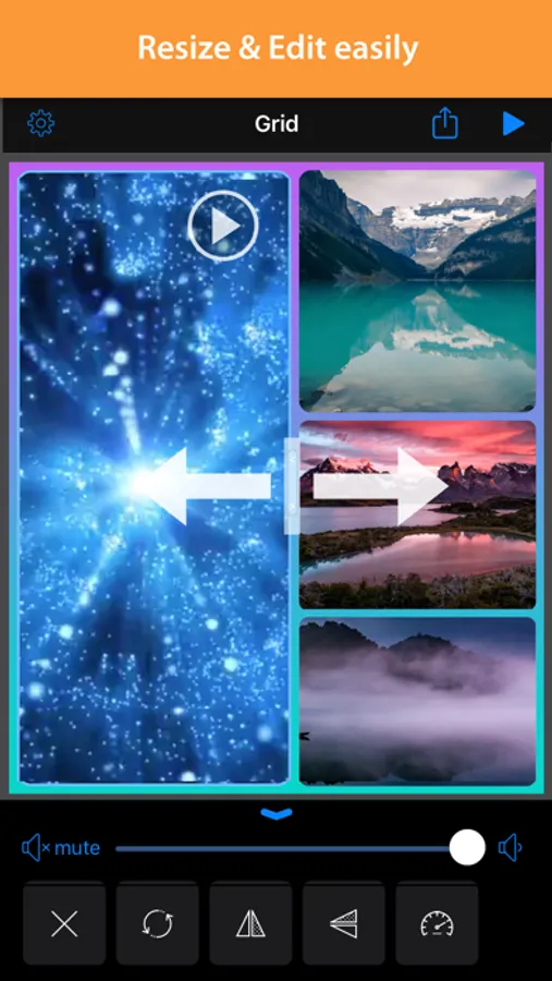 Easily mix videos and photos into a fantastic and unique video collage. With rich templates, you can easily move, resize, zoom, change speed of your videos and put them into one collage quickly.